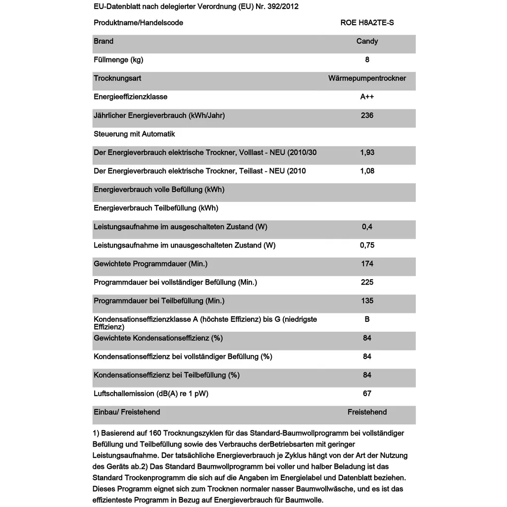 Candy ROE H8A2TE-S WÄRMEPUMPENTROCKNER 8kg