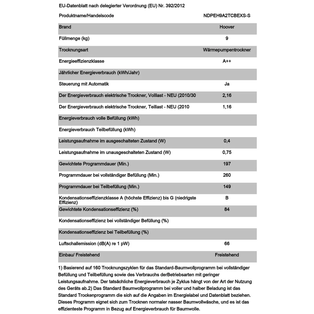 Trockner Wärmepumpentrockner 9kg AquaVision Hoover NDPEH9A2TCBEXS-S Freistehend